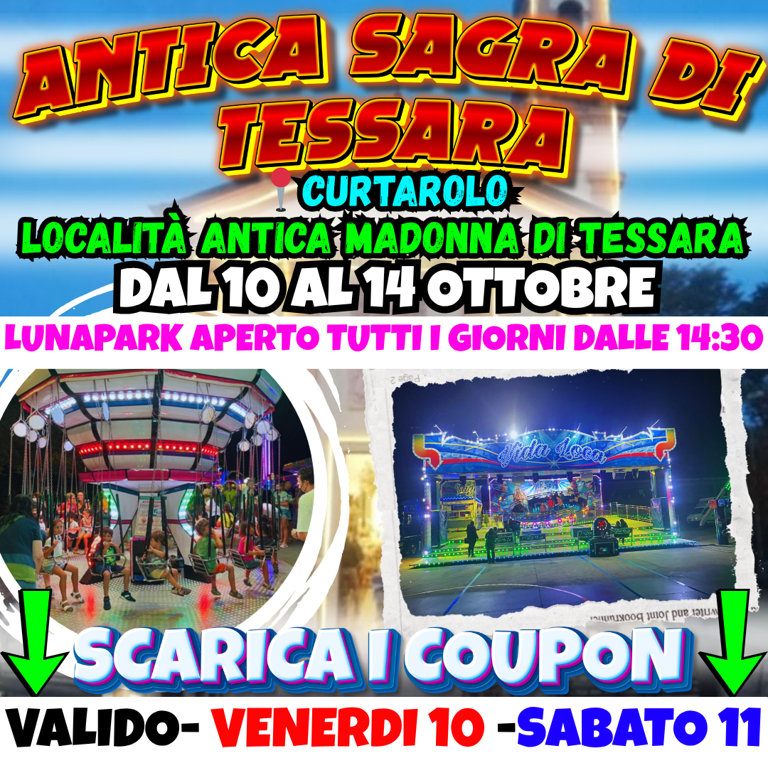 🚗In Auto: imposta il navigatore su Località Antica Madonna di Tessara, Curtarolo (PD). Parcheggi disponibili nei pressi dell’area sagra e del Luna Park.